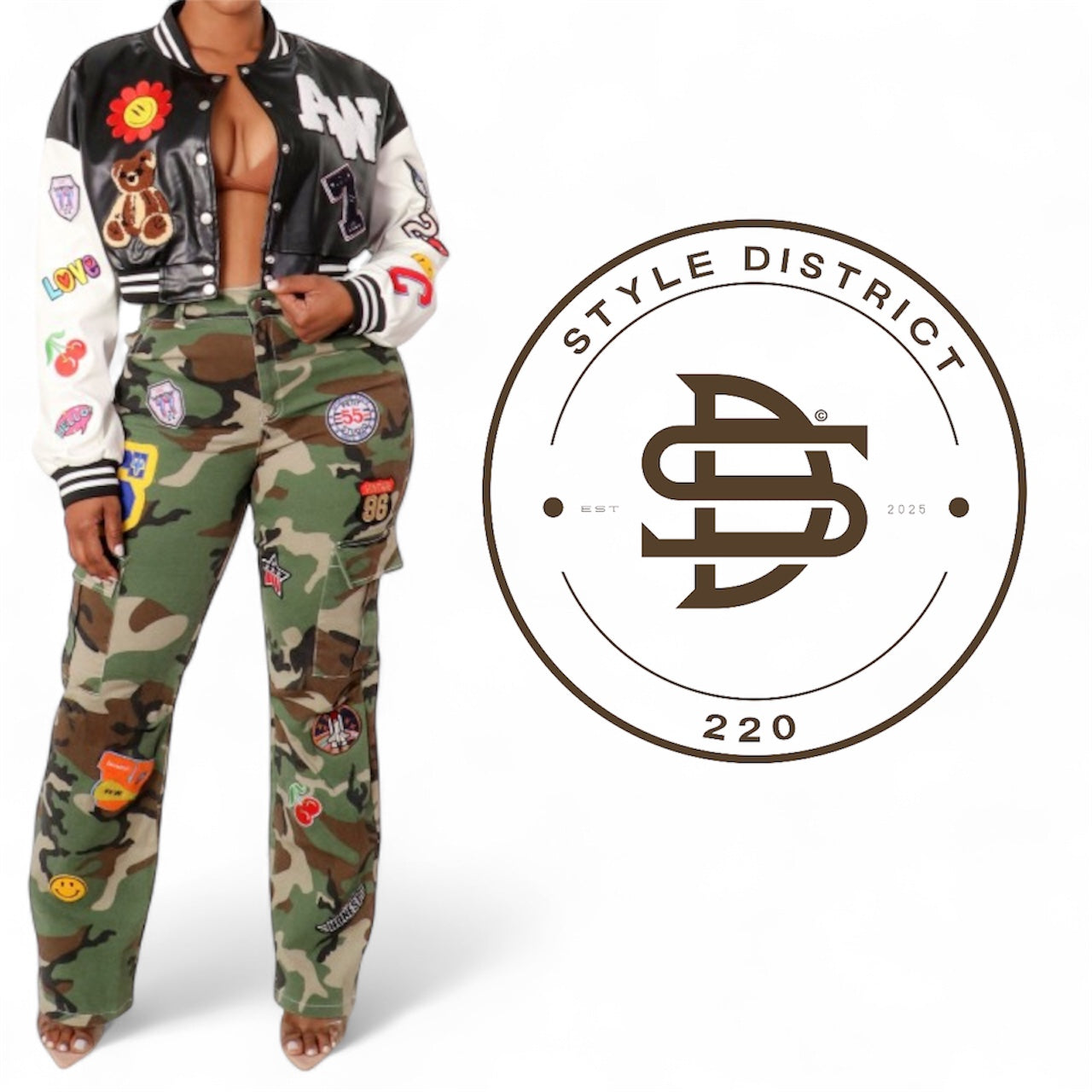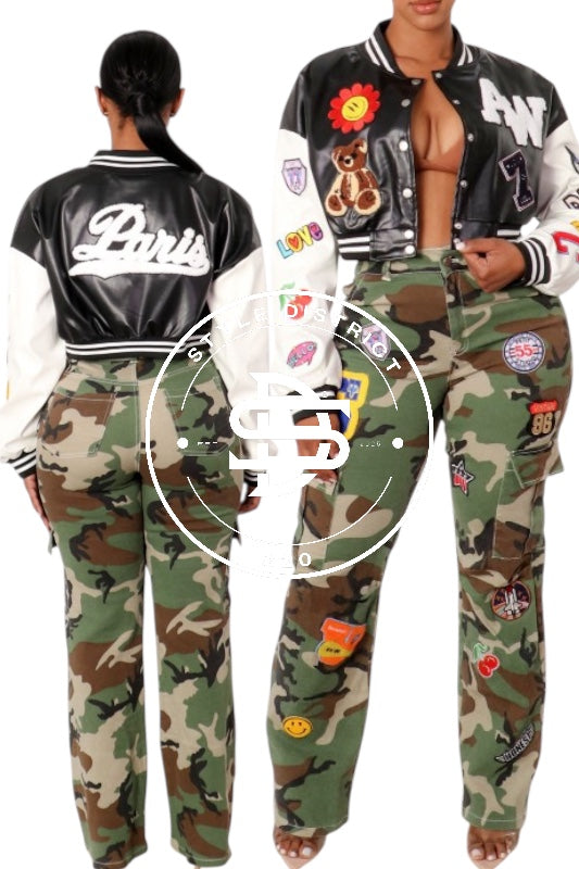 Cropped style faux leather jacket. Varsity style. Embroidered patchwork on back, front and sleeve detail.